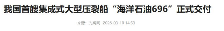 第一件,3月10号,浙江舟山传来消息,我国首艘100%国产化设计建造的集成式大型压裂船“海洋石油696”正式交付了。